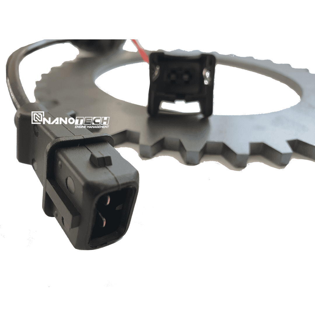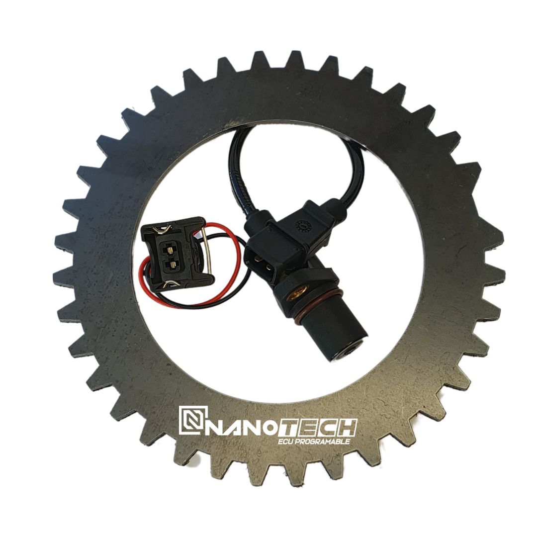 El Kit Rueda Fónica, incluye rueda fónica 36-1, sensor ckp (inductivo de 880 ohm de 2 pines) y enchufe EV1 (2 pines).